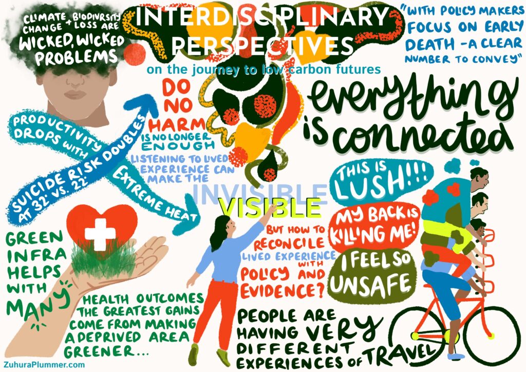 The event concluded with reflections from Dr Sarah Briggs, with the display of engaging visual minutes which conveyed key themes of the afternoon’s discussions created by Zuhura Plummer. Sarah spoke of how necessary changes within the health and care system are nested within broader societal and systems change, concluding that environmentally sensitive health and care must go beyond carbon. The evening culminated in a networking reception – a great opportunity to reflect and make new connections.